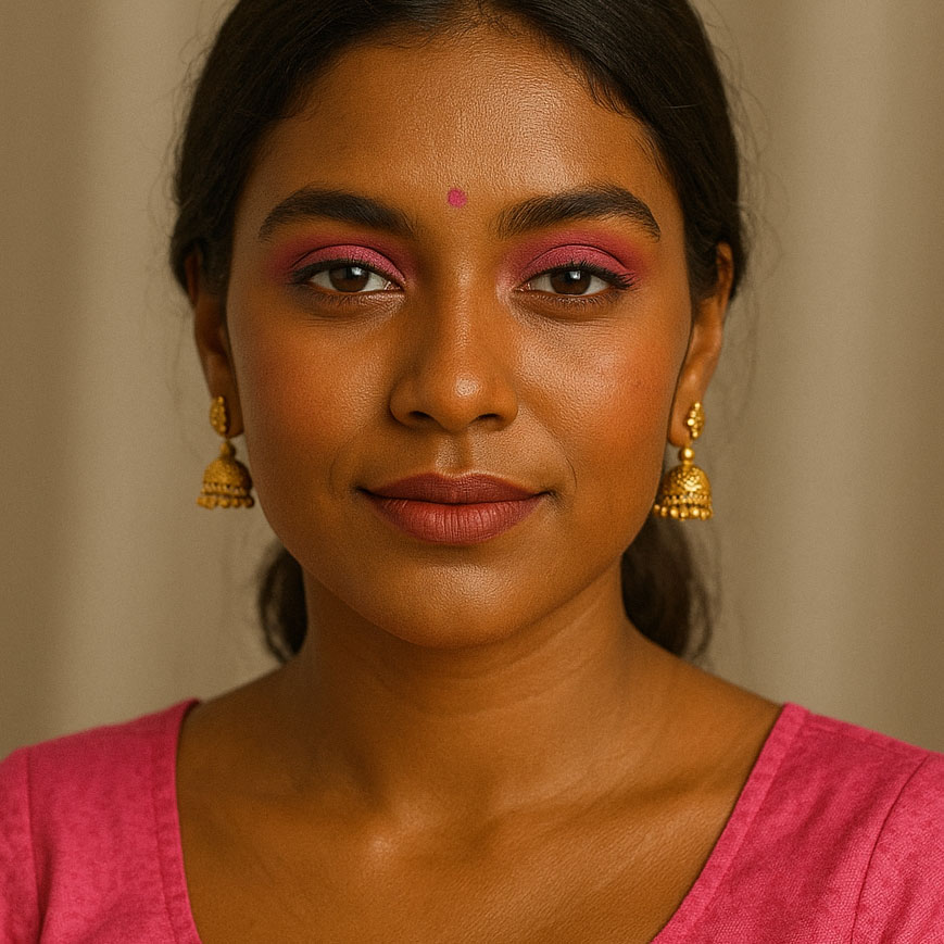 Fuchsia on almond bronze? Festive fire. Tap to wear pink the fearless way.